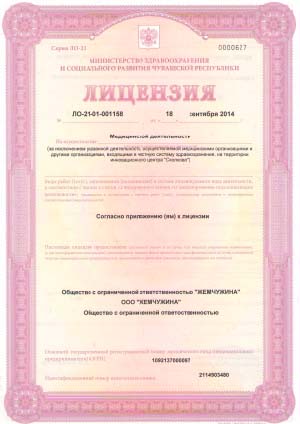 Лицензия на осуществление медицинской деятельности ЛО-21-01-001158 выдана Министерством здравоохранения и социального развития Чувашской Республики от 18 сентября 2014 года.